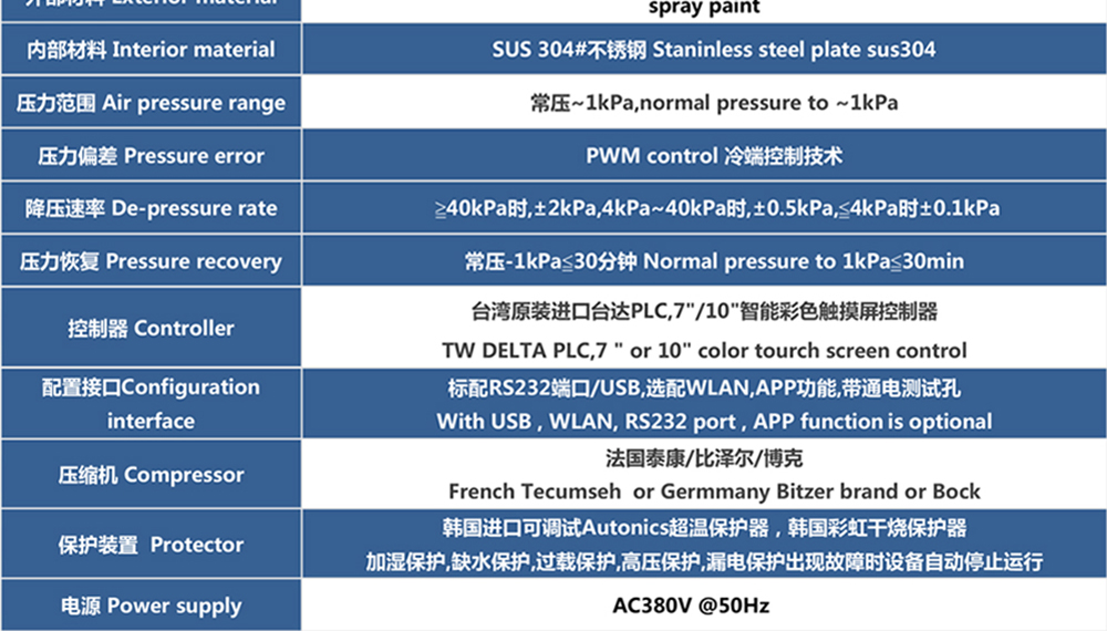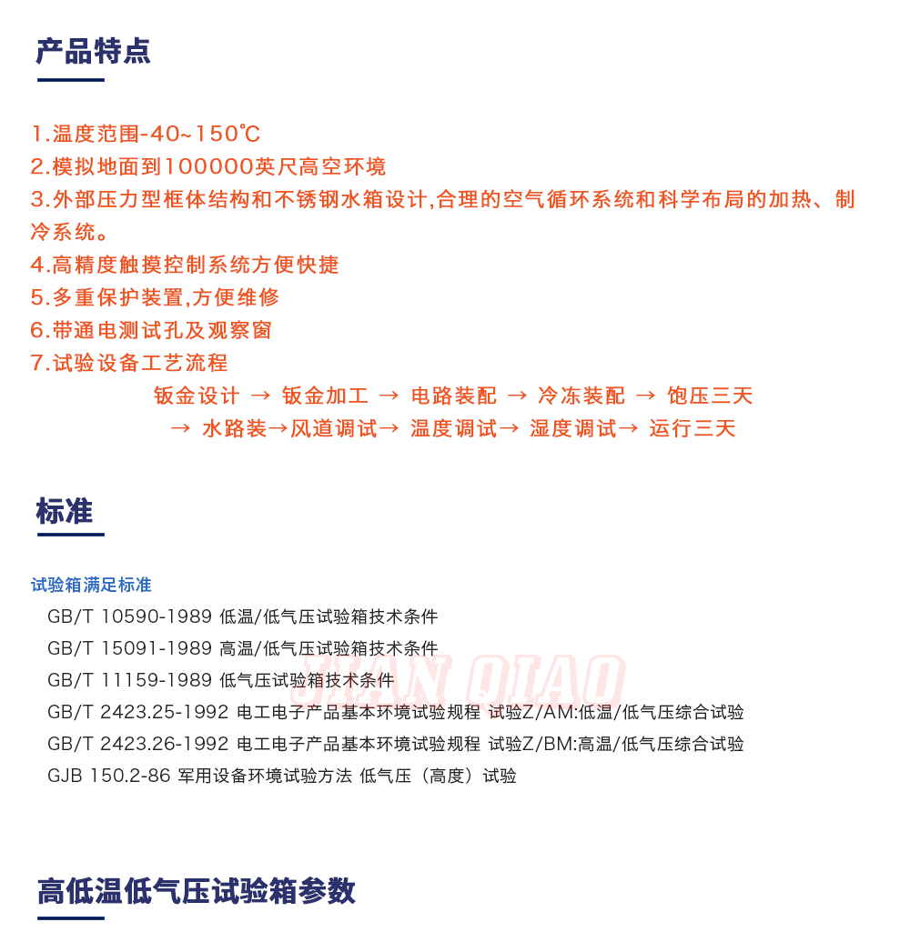 用途:高低溫低氣壓試驗箱:主要用于試驗工件在低氣壓、高溫低溫、凝露、結霜單項或同時作用下的環境適應性與可靠性試驗,并或同時對試件通電進行電氣性能參數的測量。