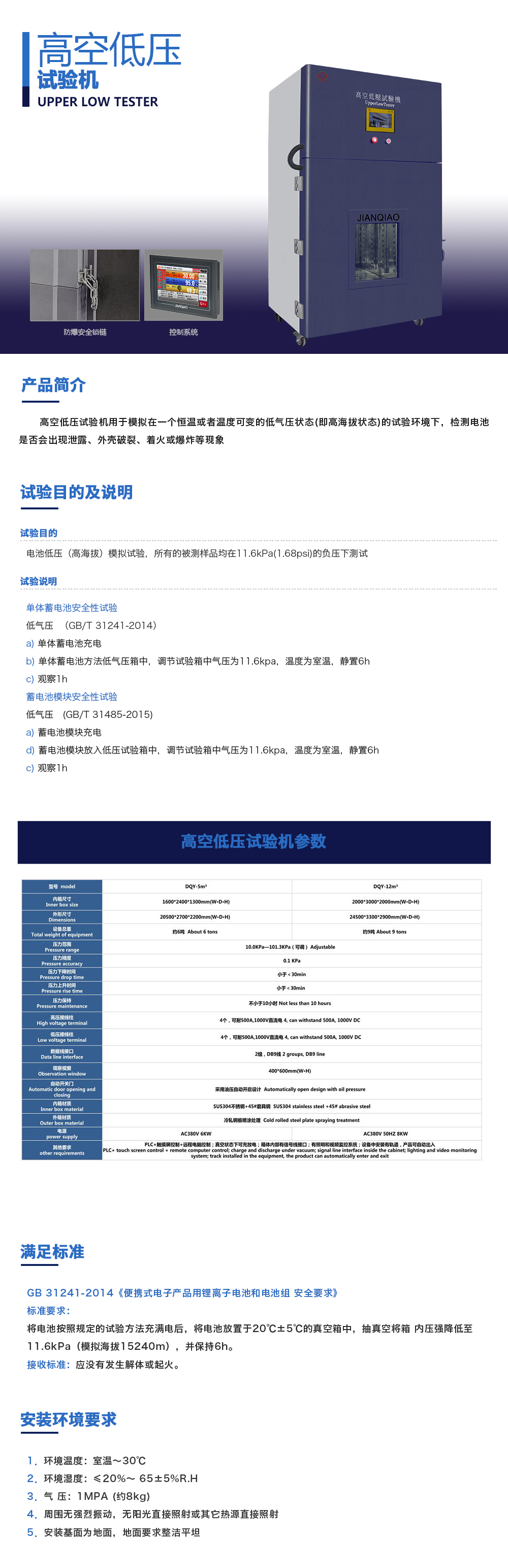 產(chǎn)品型號:JQ-8104(可定制) 品牌:劍 喬 用途:高空低壓試驗機(jī)用于模擬在一個恒溫或者溫度可變的低氣壓狀態(tài)(即高海拔狀態(tài))的試驗環(huán)境下,檢測電池是否會出現(xiàn)泄露、外殼破裂、著火或爆炸等現(xiàn)象。咨詢熱線:13829135130